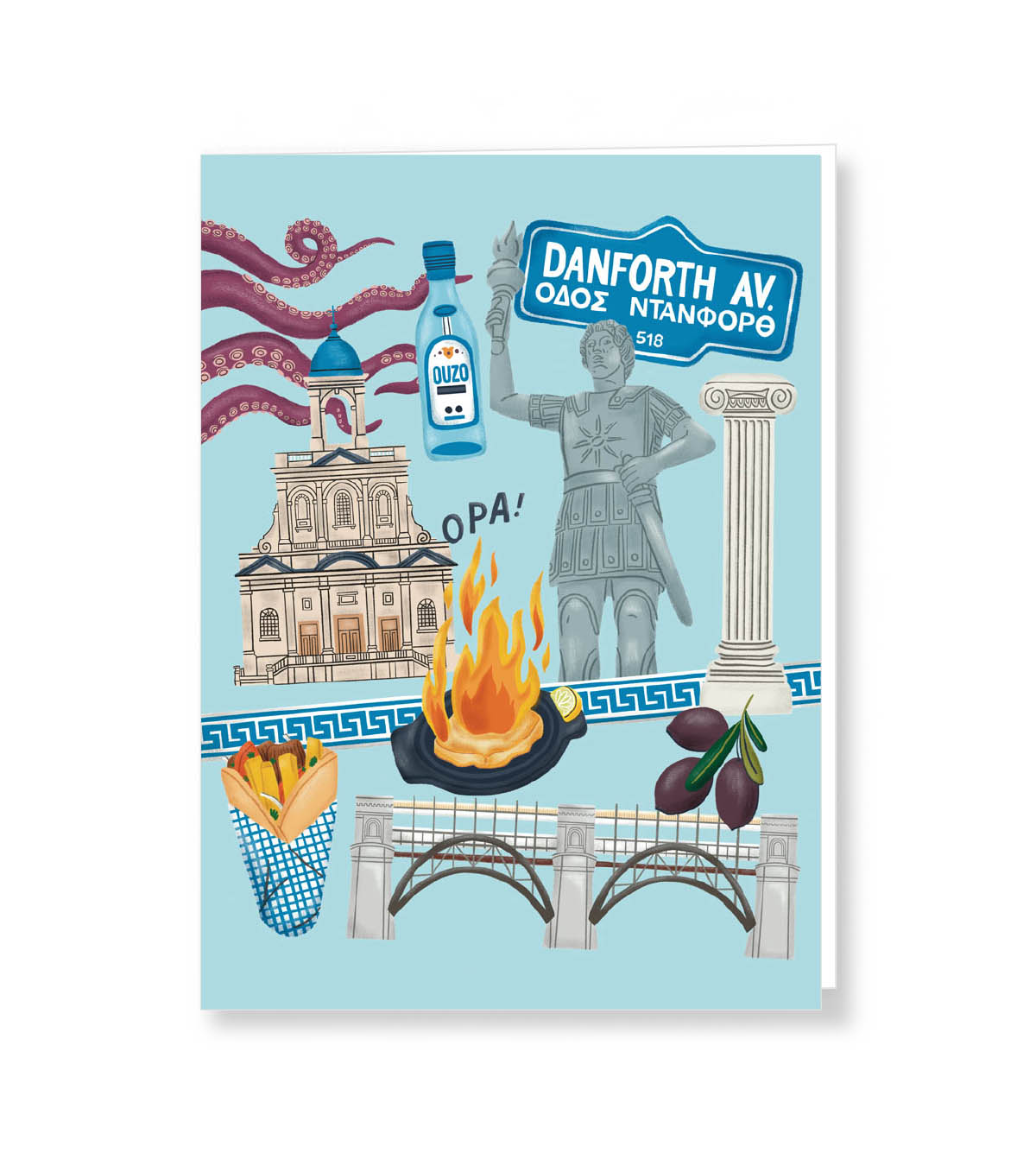 Celebrate the vibrant culture of Greektown with our Greeting Card! Featuring a charming design, this card showcases the unique charm of the neighbourhood. Perfect for sending warm wishes. Experience the beauty of Greektown.