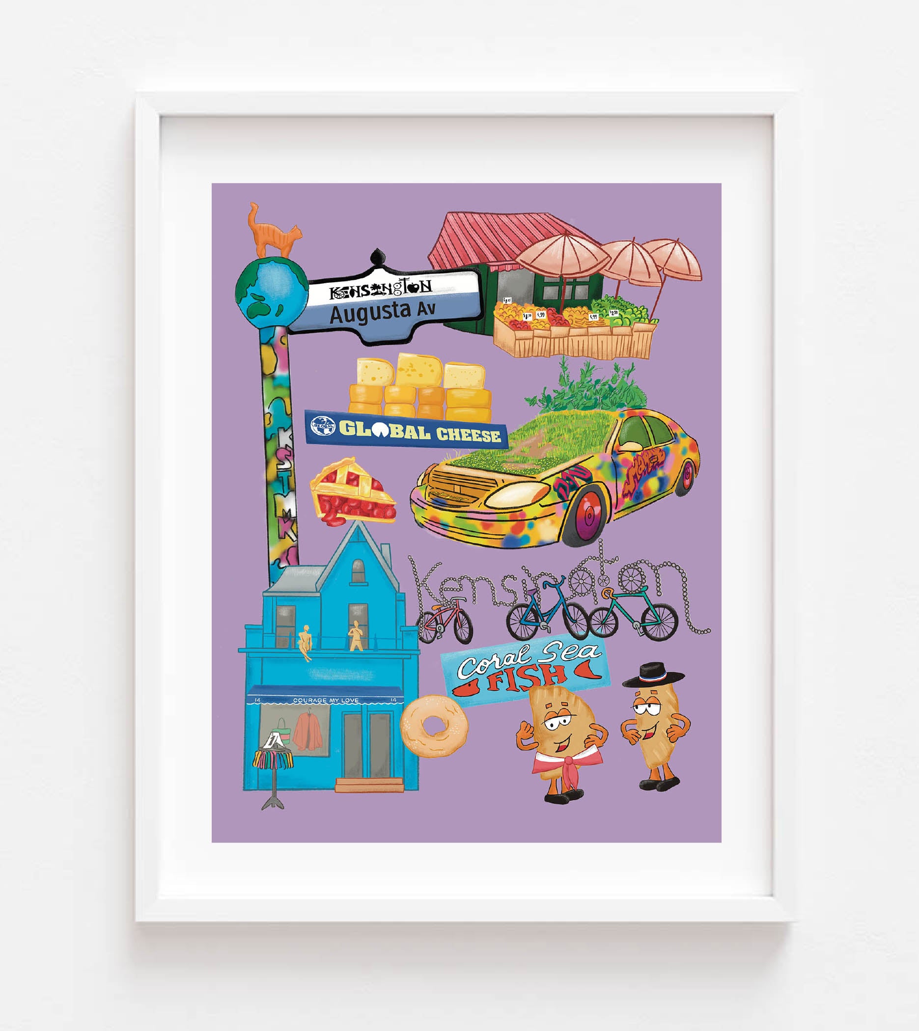 Explore the vibrant spirit of Toronto's Kensington Market with this colourful print. With its central location in the heart of the city, this neighbourhood captures the essence of diverse and lively community. Bring a piece of this unique and bustling area into your home.